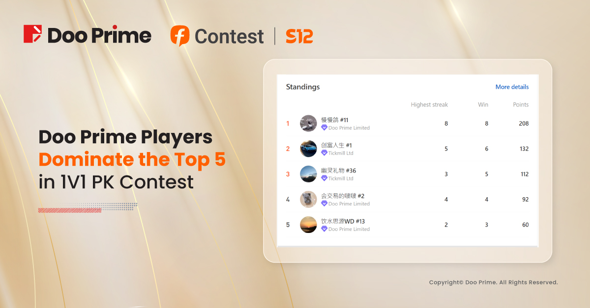 Doo Prime has always been committed to providing quality and efficient services to its users and hopes to enhance their trading experience through the FOLLOWME S12 Trading Contest. In being part of the competition, Doo Prime aims to facilitate knowledge exchange and strategy sharing among investors. At present, the FOLLOWME S12 Trading Contest is already halfway through, with contestants fiercely competing for the coveted championship title and generous rewards.