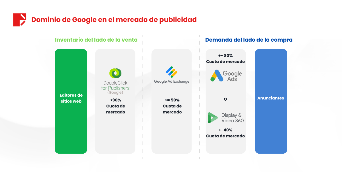 El 9 de septiembre, el DOJ intensificó sus esfuerzos al lanzar una segunda investigación contra Google, acusándolo de intentar monopolizar el sector de la publicidad en línea. Google domina este mercado al cobrar tarifas a los editores por la colocación de anuncios y a los anunciantes que ejecutan campañas a través de Google Ads o Display & Video 360. Vea la imagen a continuación.