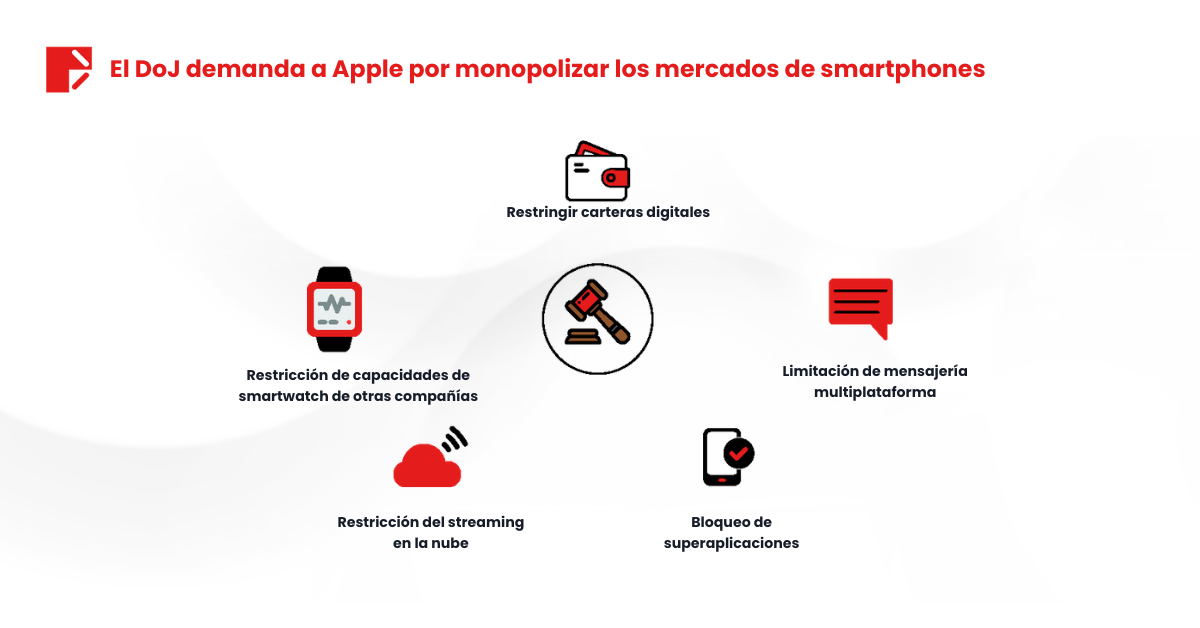 Este año comenzó con una importante demanda antimonopolio contra Apple, iniciada por el DOJ. La demanda alega que Apple participa en prácticas restrictivas que suprimen la competencia y la innovación: