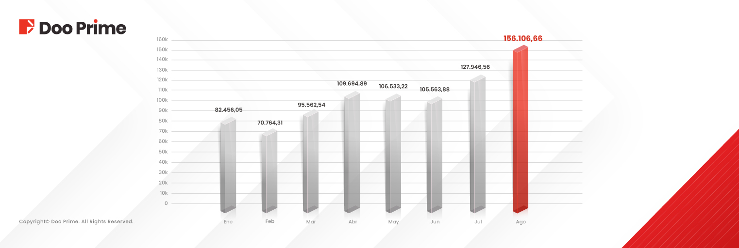 Doo Prime continuó su repunte en el volumen de trading desde julio y mostró un aumento en agosto. En lo que va del año, el volumen total de trading de Doo Prime tiene un valor de 854,60 mil millones de dólares, una expansión del 35,23% en comparación con el mismo período del año pasado.