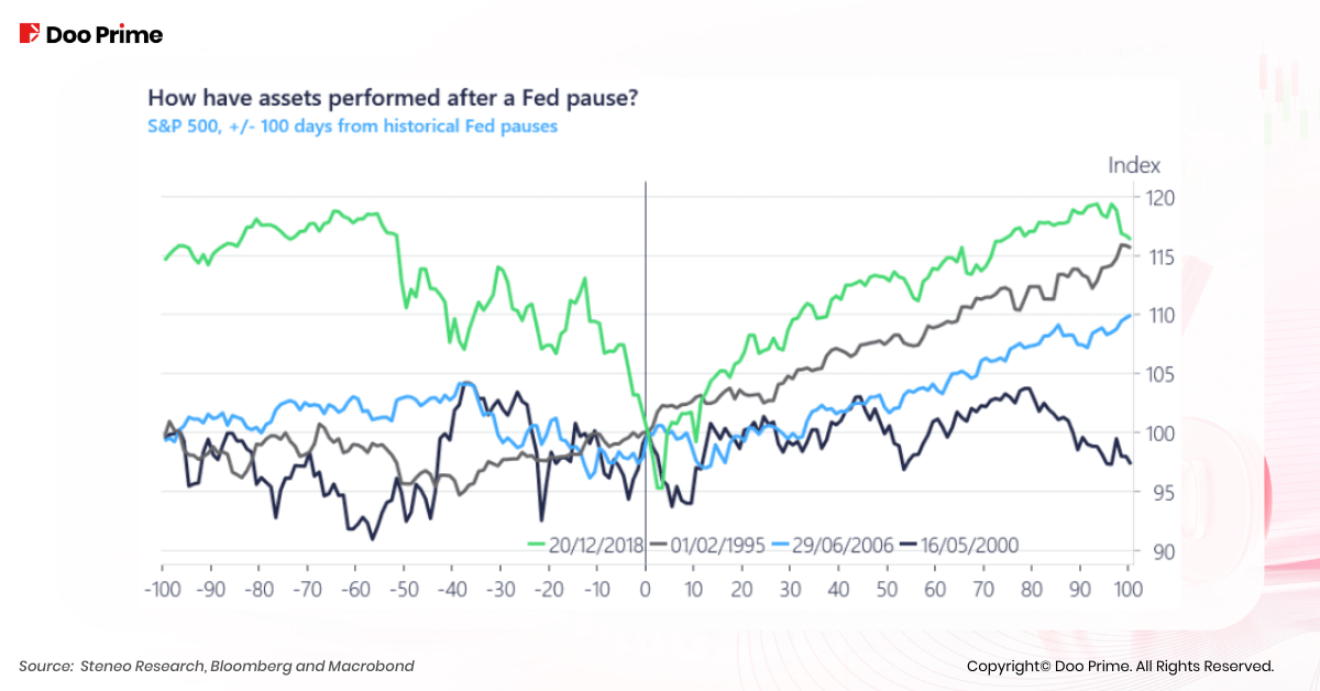 Typically, U.S. stocks tend to rise during a pause in rate hikes, but they often experience significant turbulence once the rate hikes are resumed. The Federal Reserve’s decision to pause its hawkish stance presents a dilemma for investors. They need to navigate how to capitalize on the potential gains in U.S. stocks while protecting themselves against a possible pullback in the market.