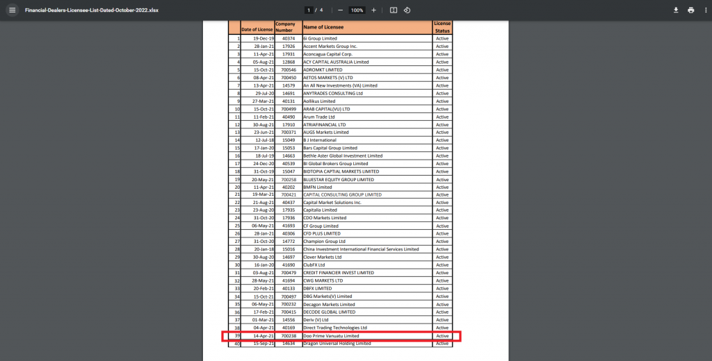 Step 5: The name of “Doo Prime Vanuatu Limited” will be shown in the list, including its company number and license status.