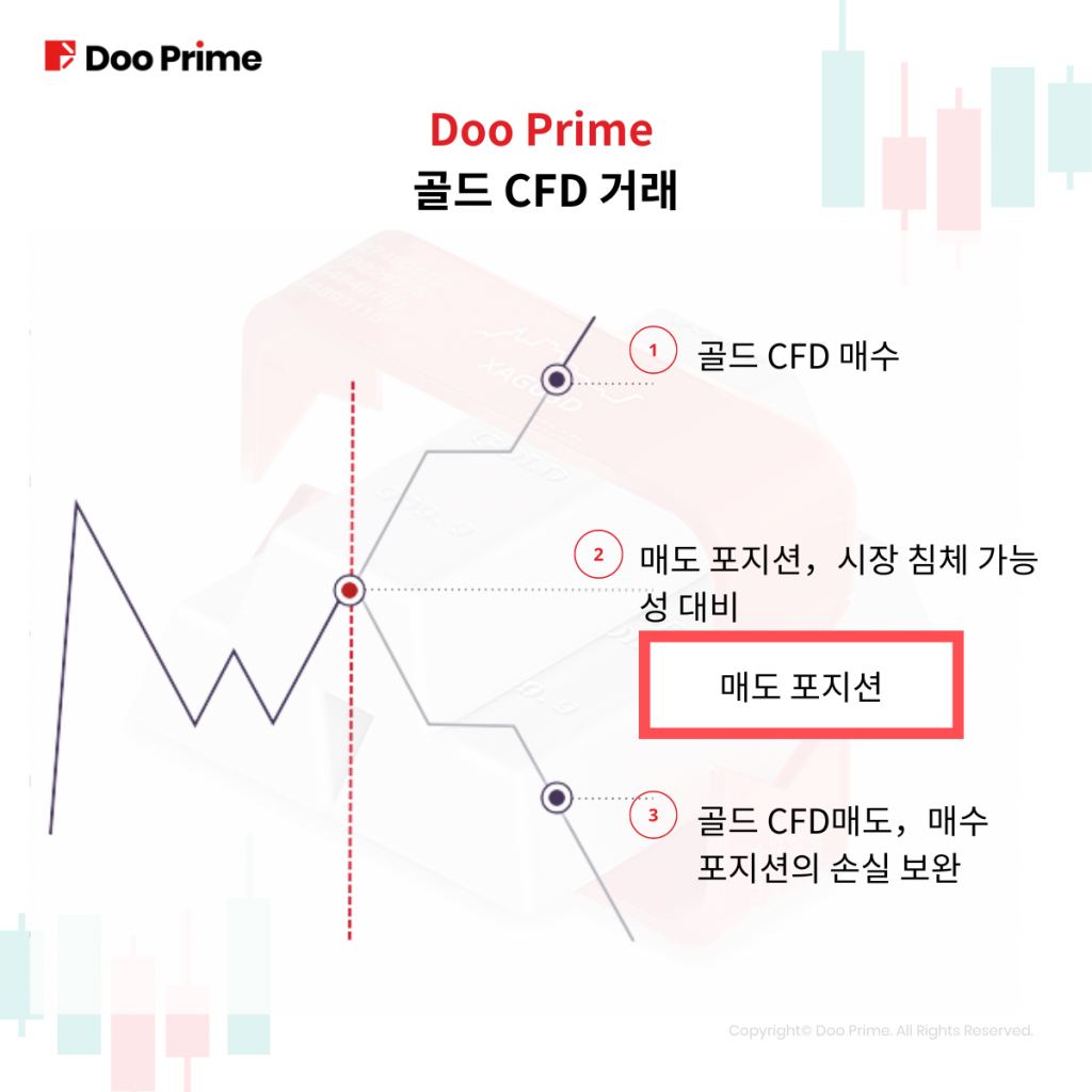 만약 이미 골드 차익계약의 매수 포지션이 있고 장기 보유할 계획이라고 가정했을때 가격이 하락할 것이라고 예상되면 차익 계약의 특성을 이용하여 매도 포지션을 잡아 잠재적인 위험을 상쇄할 수 있습니다. 이렇게 하면 골드 차익계약의 매수와 매도 포지션을 동시에 가지게 됩니다.