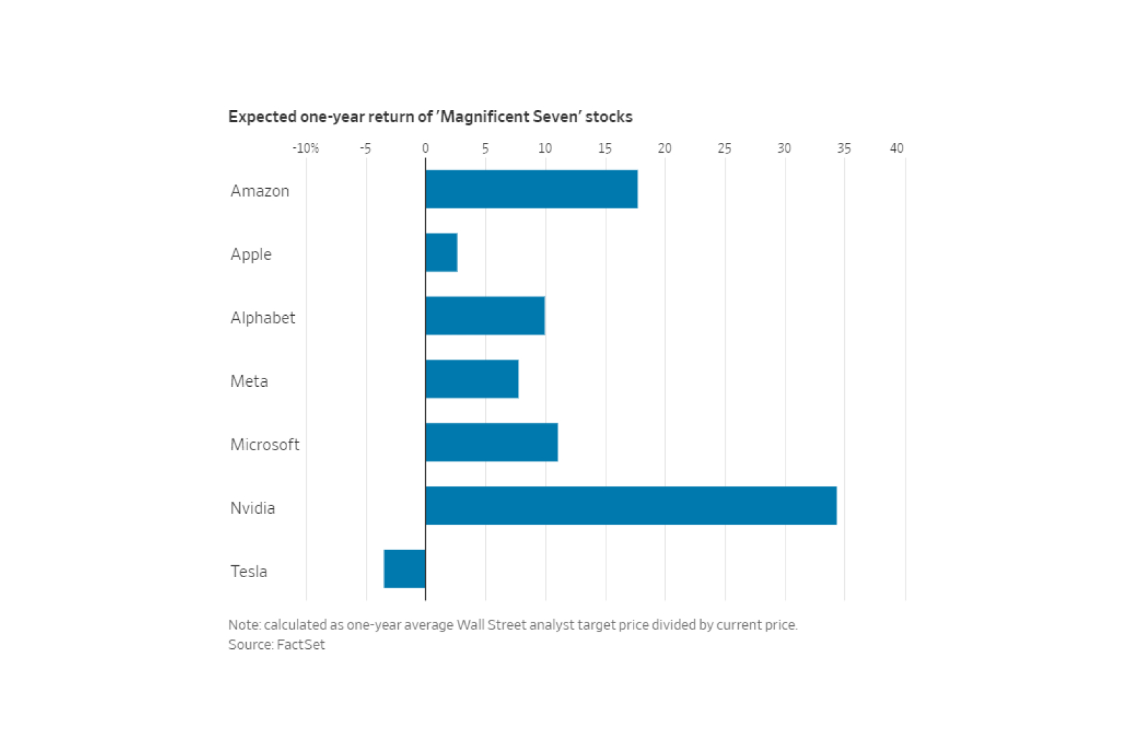 Estimates compiled by FactSet reveal that the average one-year price target for stocks among the ‘Magnificent Seven’ is approximately 11% higher than the closing price of Friday. Among these stocks, Nvidia stands out with the highest anticipated return, expected to reach about 34%. On the contrary, Tesla is trailing behind, with analysts projecting a decline of 3% in its stock value.