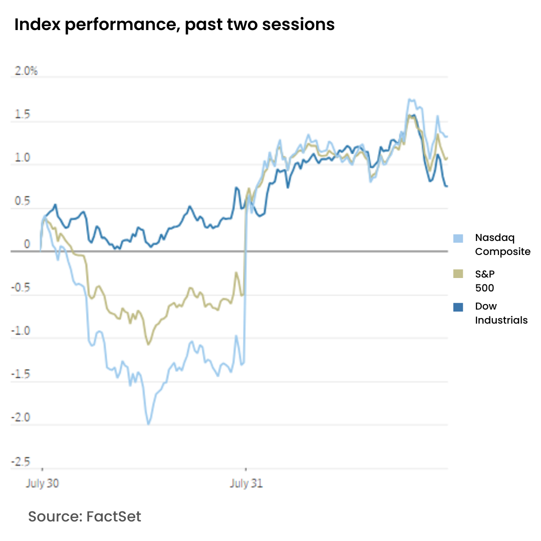All major U.S. indexes started the day with notable increases, maintaining their upward trajectory after the Federal Reserve opted to keep interest rates steady. Federal Reserve Chair Jerome Powell hinted at a potential rate cut in September, if inflation continues moving lower.