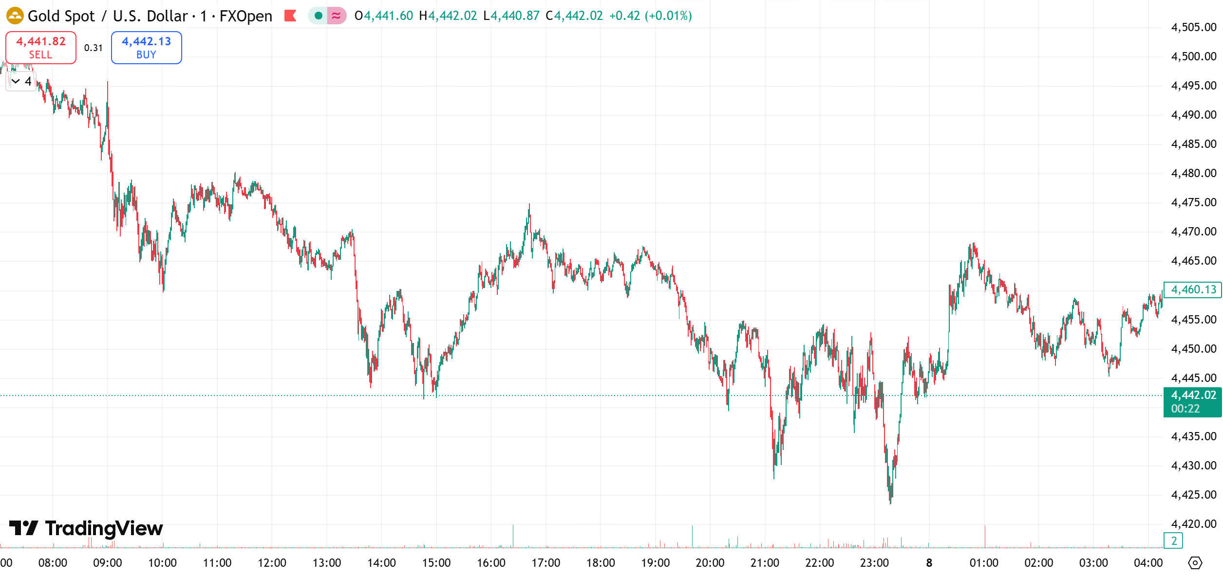 From a technical perspective, gold reversed sharply after testing the $4,500 per ounce level, falling to an intraday low near $4,423 before settling around $4,456. Daily and intraday charts suggest the prior rally left prices in overbought territory, prompting corrective selling.