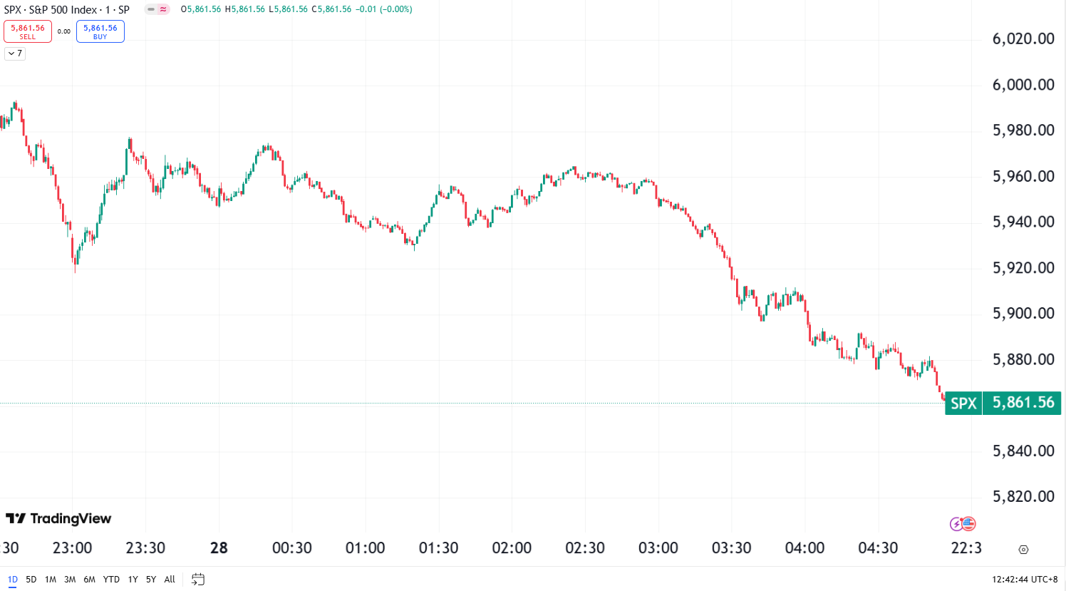 - S&P 500: ▼ 94.49 pts (-1.59%) to 5,861.57