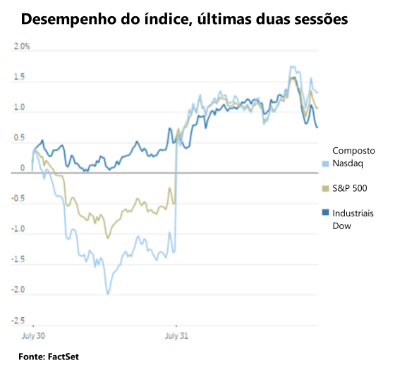 Em julho, o S&P 500 e o Dow apresentaram ganhos mensais gerais de 1,1% e 4,4%, respectivamente, embora o Nasdaq tenha caído ligeiramente em 0,8%. Apesar de alguma volatilidade ao longo do mês, as negociações de quarta-feira indicaram um interesse sustentado dos investidores em grandes empresas de tecnologia.