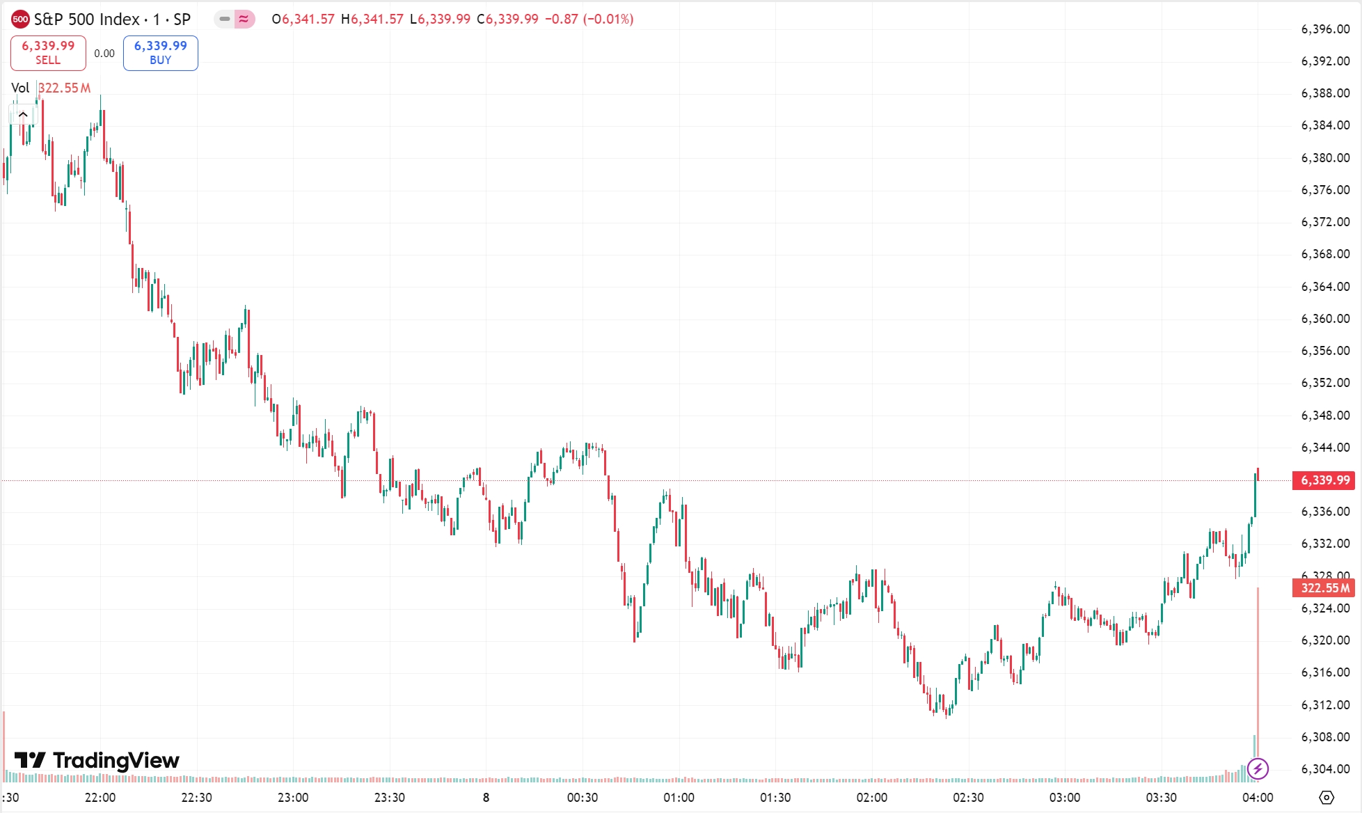 - 标普 500 指数跌 5.06 点,跌幅为 0.08%,报 6,340.00 点
