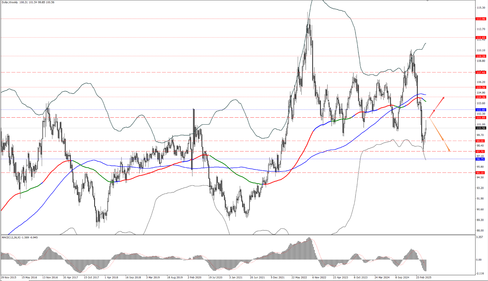 - 如果美指运行于 101.85 一线下方,则关注美指随后的下行力度,届时依次关注 99 和 97.70 两个位置的支撑力度;