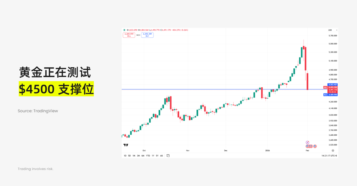 谁是 2026 年最吸睛的资产?不是比特币,不是股票,而是黄金。在经历了两周 20% 的上涨之后,却在上周“黑色星期五”创下近半个世纪以来的最大单日跌幅( 11.4% )。而本周一开盘之后,黄金依然延续着瀑布式的下跌,测试着 4500 美元的支撑位,但这里似乎根本守不住空头的抛售。