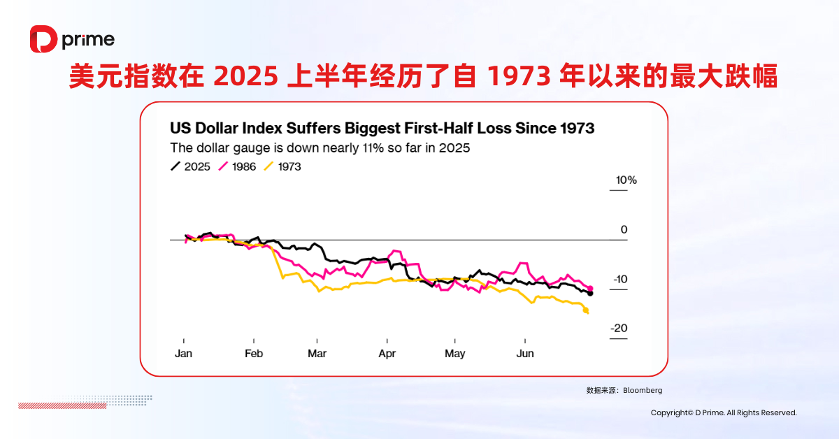 2025 上半年美元指数累计下跌约 10.8%,创下自 1973 年上半年下跌 14.8% 以来的最差纪录。