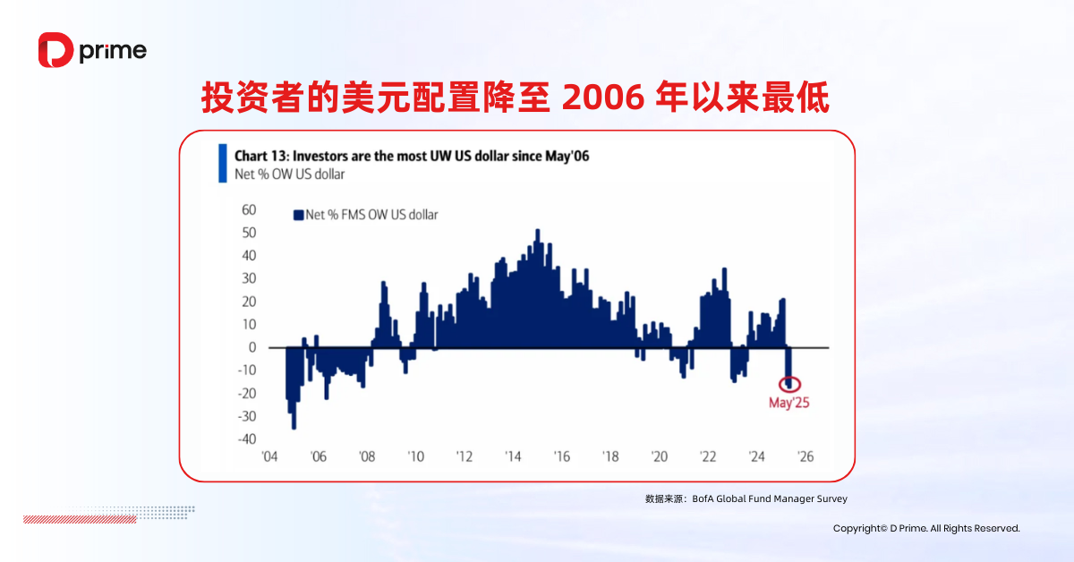 美元作为全球避险货币的地位正面临挑战,据美国银行最新发布的一项基金经理调查显示,全球基金经理的美元配置比例已降至 2006 年 5 月以来的最低水平,反映出国际投资者对持有美元资产的兴趣正在减弱。