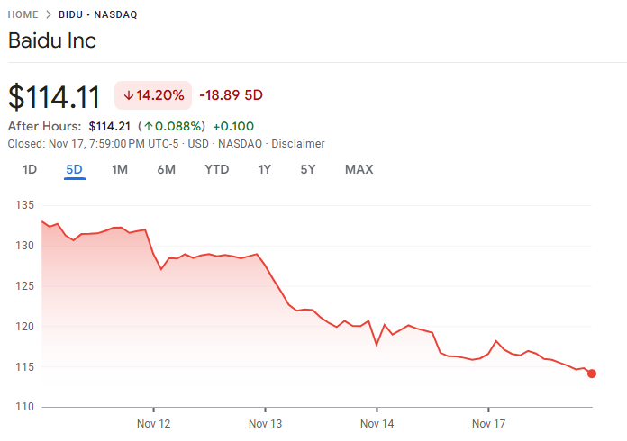 11 月 17 日至 18 日,百度(BIDU)周五举行了旗下旗舰模型 Ernie 5.0 的发布会,但升级内容被认为缺乏亮点,引发投资者失望,股价随即大幅下挫。
