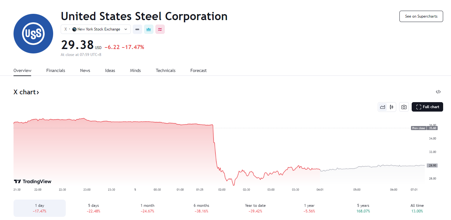 周三,美国钢铁公司股价一度暴跌超 24%,引发波动性熔断暂停。美股收盘,美国钢铁收跌超 17%,收于 29.38 美元。