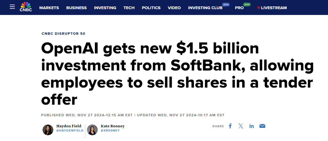 11 月 27 日,消息称 OpenAI 已从软银集团获得 15 亿美元的新投资,而且将允许公司的现任和前任员工以收购要约的形式出售股份。