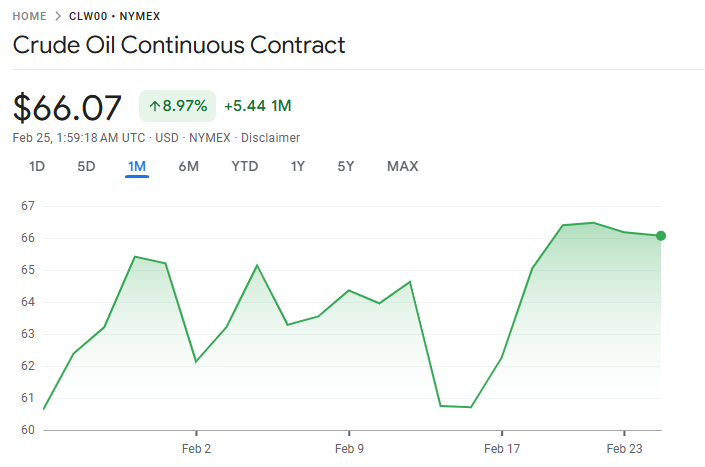 4 月交割的纽约商品交易所西得州中质原油(WTI)期货下跌 0.68 美元,跌幅 1%,收于每桶 65.63 美元。早前,布伦特原油一度有望触及自 7 月 31 日以来的最高收盘价,而 WTI 亦曾创下自 8 月 1 日以来的阶段高点。