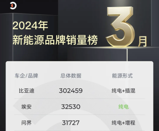 4 月 1 日,中国多家新能源车企陆续公布 3 月份交付量报告。比亚迪以 302,459 的交付量稳居国内新能源销量榜单首位;广汽埃安和问界分别位居第二、第三;理想交付 28,984 辆紧随其后;小鹏和哪吒 3 月交付未过万辆。