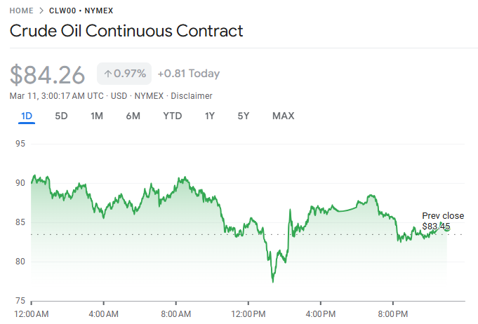 国际油价周二重挫,创下自 2020 年以来最大单日跌幅。西得州中质原油(WTI)下跌 12%,收于每桶约 83 美元。市场剧烈波动的主因在于霍尔木兹海峡运输形势传出相互矛盾的消息,导致投资情绪急剧反转。
