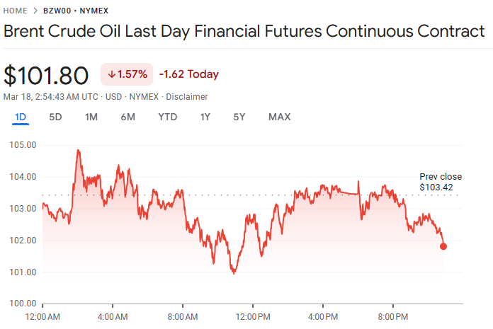 布伦特原油期货收涨 3.21 美元,涨幅 3.2%,报每桶 103.42 美元;美国 4 月交割的西得州中质原油(WTI)上涨 2.71 美元,涨幅 2.9%,收于每桶 96.21 美元。