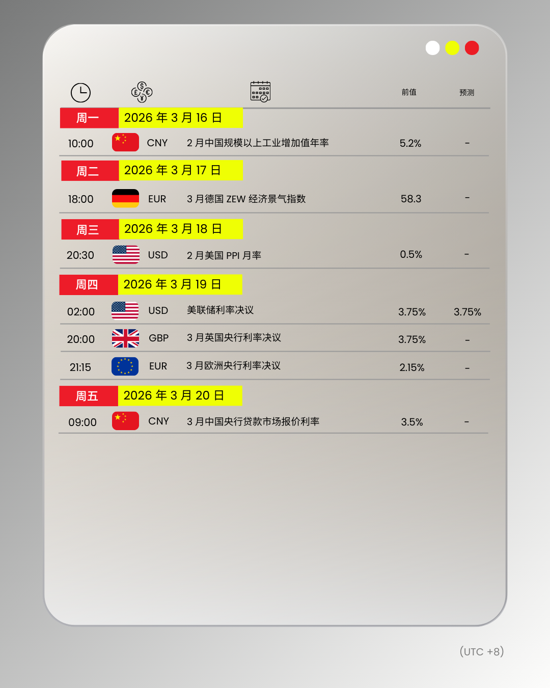 财经日历 | 以下为 2026 年 3 月 16 日至 2026 年 3 月 20 日(GMT+8 北京时间) 全球重大经济事件提醒。在重大行情期间,请确保您已审查您的保证金率,并有足够的保证金来支撑您的风险敞口。