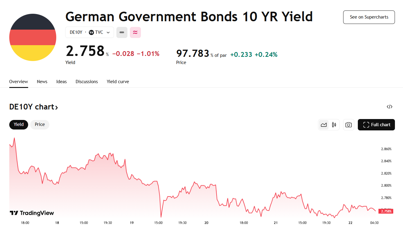 在法案获批后,德国国债持续保持涨势,10 年期收益率接近两周低点 2.76%。