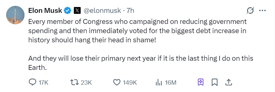 当地时间周一,特斯拉 CEO 马斯克再次抨击 “大漂亮法案”。他发文称:“每一位在竞选时承诺削减政府支出,却转身支持美国历史上最大债务增长的国会议员,都应该感到羞耻!如果这是我此生在地球上做的最后一件事,他们明年也会在初选中败北。”