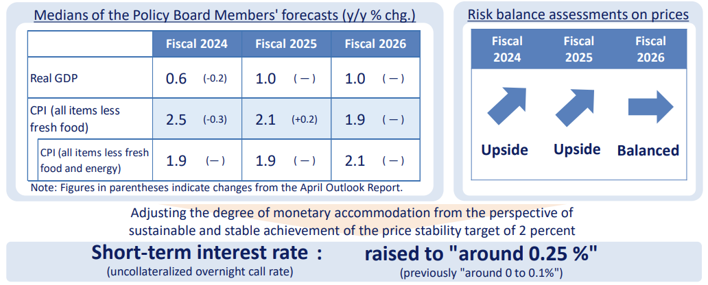 通胀预测方面,日本央行将 2024 财年核心 CPI 小幅下调至 2.5%,此前预测为2.8%;2025 财年核心 CPI 为 2.1%,此前预测为 1.9%;2026 财年核心 CPI 为 1.9%,与此前预测相同。