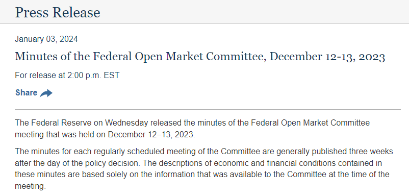 12 月会议纪要提到,“讨论政策前景时,与会者认为,政策利率可能处于或接近本轮紧缩周期的峰值,不过他们指出,实际的政策路径将取决于经济如何发展。”几乎所有与会联储决策者都暗示,到 2024 年底,适合降低政策利率联邦基金利率的目标范围,联储决策者越来越担心过度紧缩对经济的负面影响,这反映出他们的通胀前景改善预测。