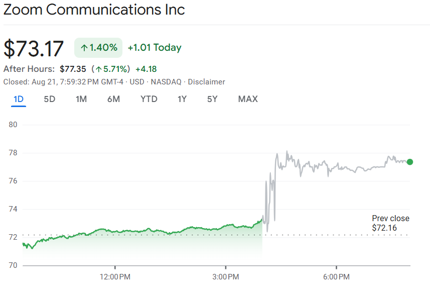 Zoom 财报优于预期,上调全年指引,盘后股价涨近 6%