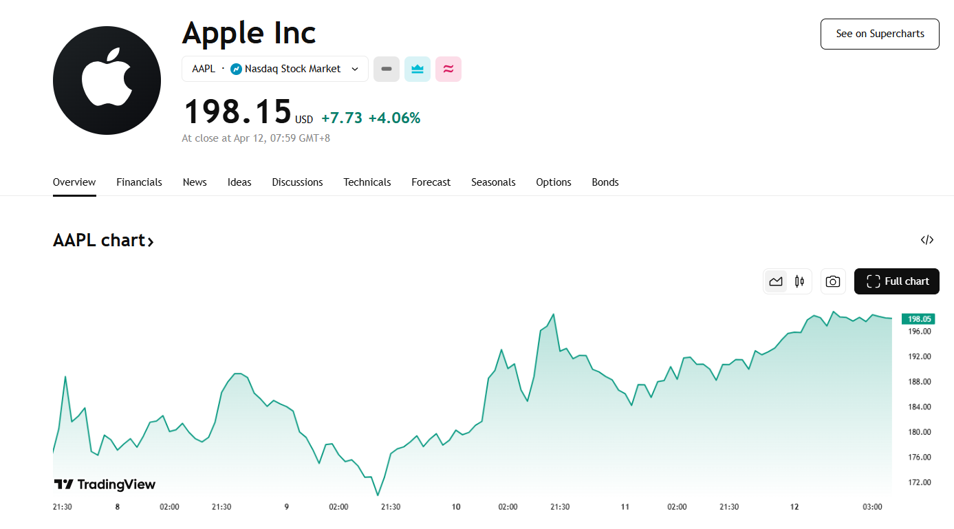 4 月 11 日,美国联邦政府已同意对智能手机、电脑、芯片等电子产品免除“对等关税”,提振苹果股价出现剧烈反弹,周五单日上涨 4.1%,收于 198.15 美元。