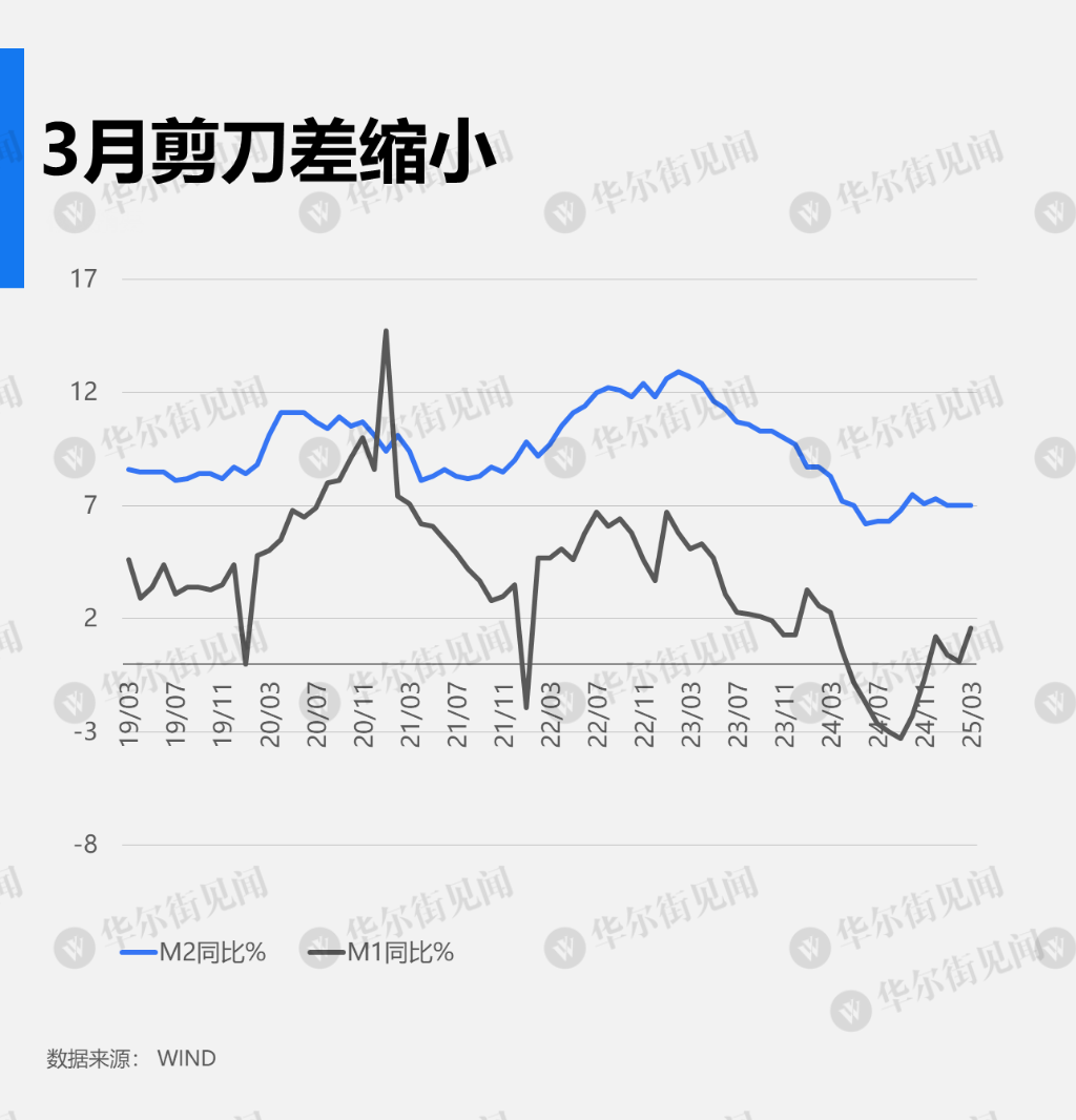 • 3 月,M2-M1 剪刀差为 5.4 个百分点,较 2 月的 6.9 个百分点缩小了 1.5 个百分点。