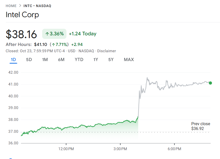 英特尔(INTC)公布第三季度财报,营收同比增长 3.2% 至 137 亿美元,优于市场预期的 131.3 亿美元;每股收益(EPS)为 0.23 美元,远高于市场预期的 0.01 美元。