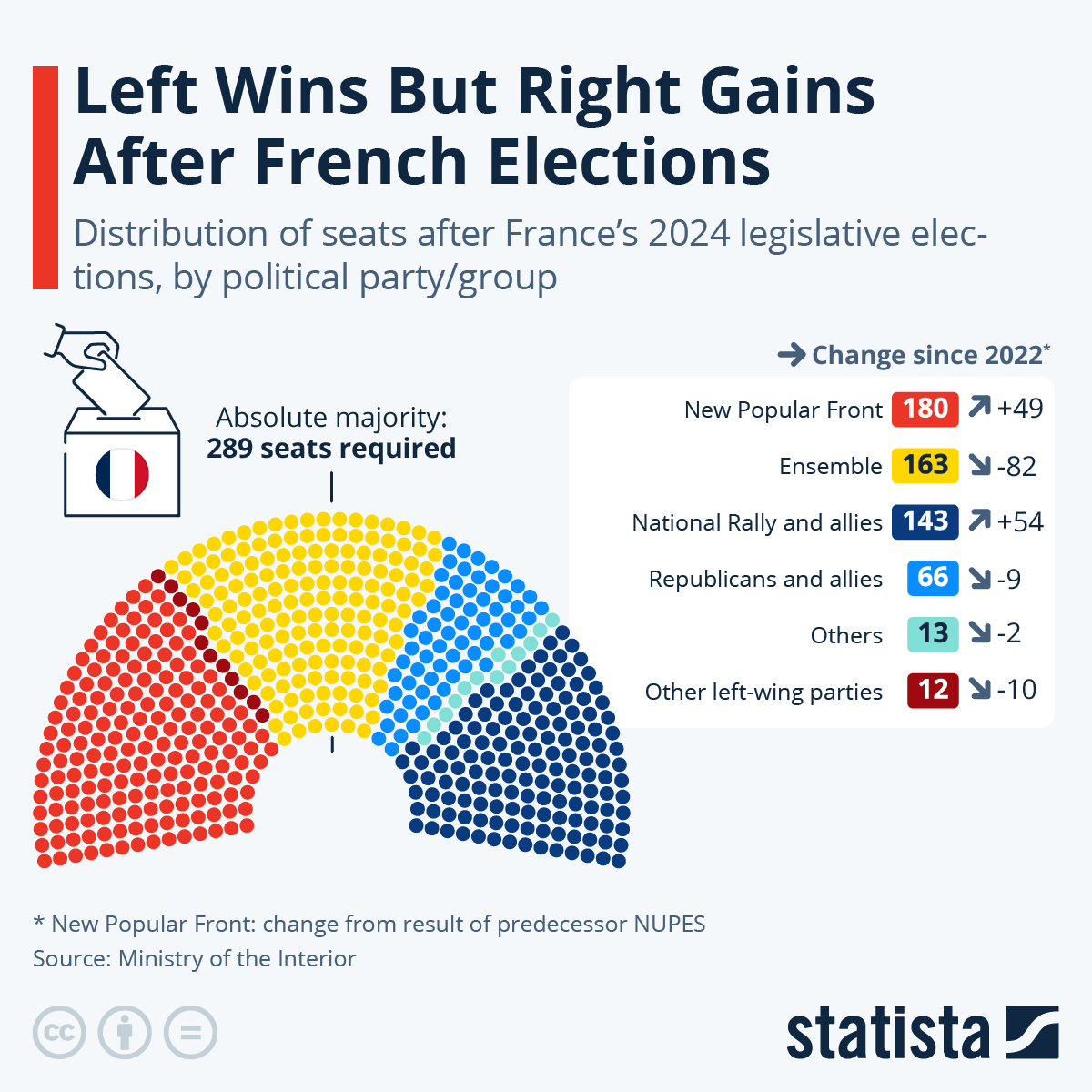 具体来看,左翼政党联盟“新人民阵线”获得约 175 至 205 个席位,但未获得绝对多数席位;执政党复兴党及其中间派联盟紧随其后获得约 150 至 175 个席位;而极右翼政党国民联盟仅获得约 115 至 150 个席位。