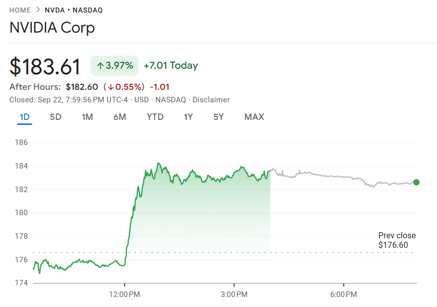 9 月 22 日至 23 日,英伟达(NVDA) 周一股价再度走强,收涨 3.93% 至 183.61 美元,创下历史新高,成交额达 488.35 亿美元,盘后微跌 0.56%。公司 总市值逼近 4.5 万亿美元,继续稳居全球半导体龙头地位。