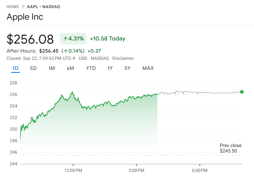 苹果股价飙升逾 4%,iPhone 17 销售带动换机潮