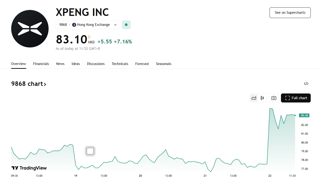 22 日,小鹏汽车(09868)高开近10%,涨 9.74%,报 85.1 港元,成交额 1.02 亿港元。