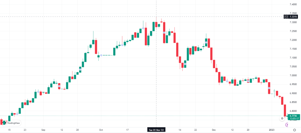 - 2023 年开年第 2 个交易日,在岸人民币兑美元汇率收盘价升破 6.9 元;