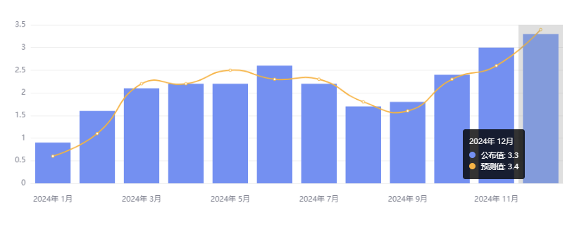 14 日,美国劳工统计局公布的,12 月 PPI 同比上涨 3.3%,为 2023 年 2 月以来的最高,高于 11 月的 3%,但低于预期值的 3.5%;不包括食品和能源的核心 PPI 同比上涨 3.5%,为 2023 年 2 月以来的最高,高于 11 月的 3.4%,低于预期的 3.8%。
