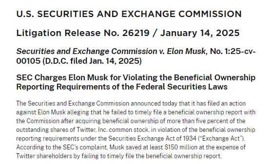 14 日,美国证券交易委员会(SEC)已在华盛顿特区联邦法院起诉埃隆・马斯克,指控其在收购推特(后改名 X)之前未能及时披露其大量购买该公司股票的行为(涉嫌违反证券法)。