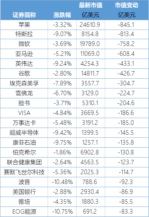美股总计近 7000 家(6947 家,不含 OTC)上市公司,昨夜总市值损失高达 2.1 万亿美元,约合人民币 14.18 万亿元(离岸人民币即期汇率,6.7558,下同);其中标普 500 指数中损失最多的前20家公司就贡献了 5989 亿美元市值损失(约合人民币 4 万亿元)。