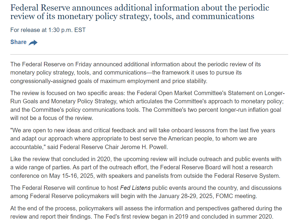 11 月 22 日,美联储发布了明年 1 月启动的框架审查计划更多细节。