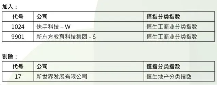 11 月 22 日,恒生指数公司宣布,将快手科技和新东方教育科技集团纳入香港恒生指数成分股,剔除新世界发展有限公司,所有变动将于 12 月 6 日收市后实施,并于 12 月 9 日起生效。