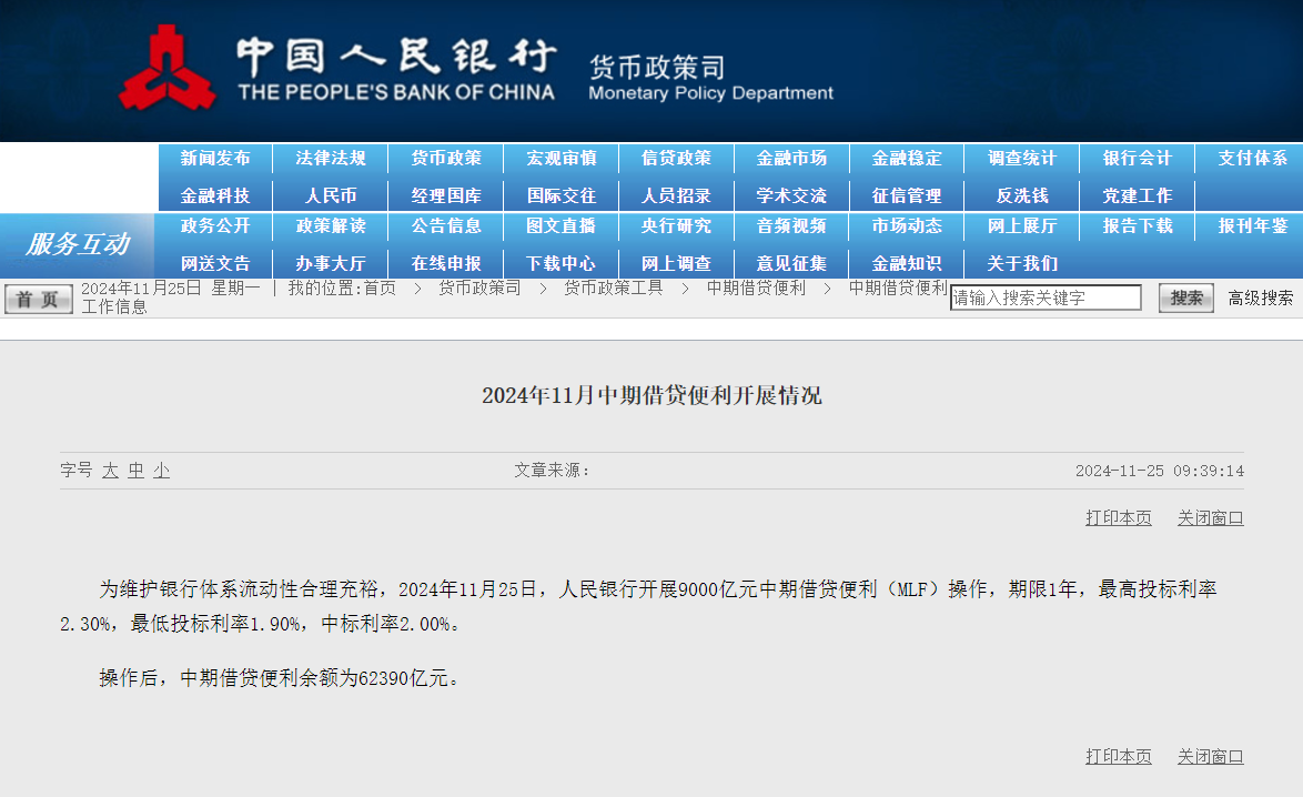 11 月 25 日,中国央行公告称,为维护银行体系流动性合理充裕,人民银行开展 9000 亿元中期借贷便利(MLF)操作,期限 1 年,最高投标利率 2.30%,最低投标利率 1.90%,中标利率 2.00%。操作后,中期借贷便利余额为 62390 亿元。