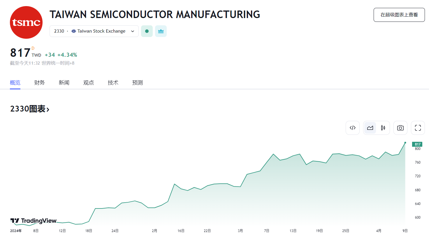 台积电(TSMC)官网公告,台积电亚利桑那州厂将获得美国晶片法案补助 66 亿美元,同事宣布计划美国设立第三座晶圆厂,透过美国最先进的半导体制程技术满足强劲的客户需求。台积电股价因此盘中涨超 3% 至 809 元新台币,创历史新高。