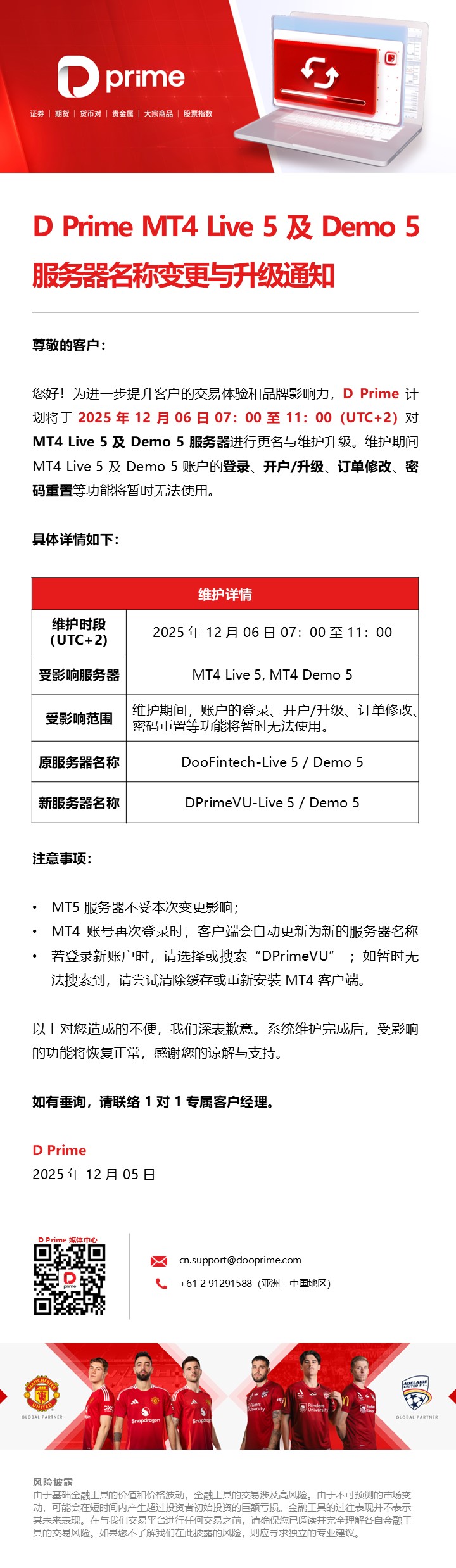 D Prime MT4 Live 5 及 Demo 5 服务器名称变更与升级通知