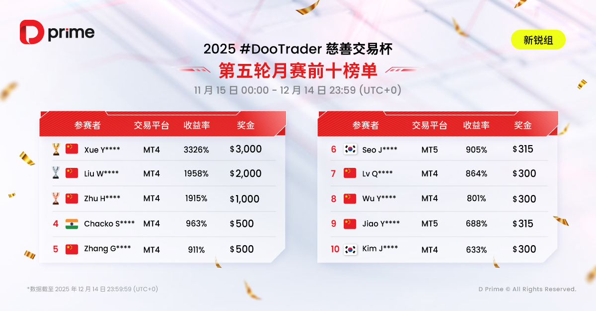 2025 年 D Prime #DooTrader 慈善交易杯第五轮月赛已于 12 月 14 日 23:59(UTC+0)顺利收官,赛果榜单火热揭晓!第六轮月赛紧随于 2025 年 12 月 15 日 00:00(UTC+0)开赛 —— 欢迎各路交易高手立刻报名,争夺最后轮月赛破浪组 TOP5 晋级线下岛屿争霸赛名额!