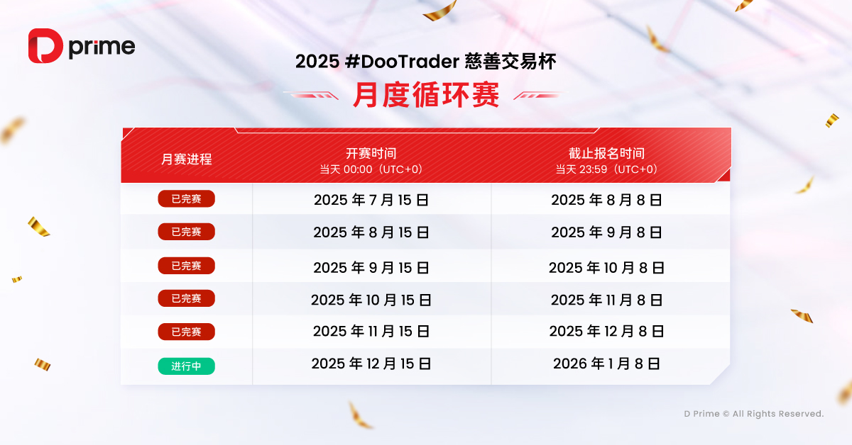 值得关注的是,2025 #DooTrader 慈善杯交易杯不仅是一场较量,更是一个传递爱心的公益活动。每当您在比赛中完成 1 手交易,D Prime 都将代表您捐出 0.1 美元,帮助改善贫困儿童的教育条件,让您的每一笔交易助力点亮更多孩子的未来。