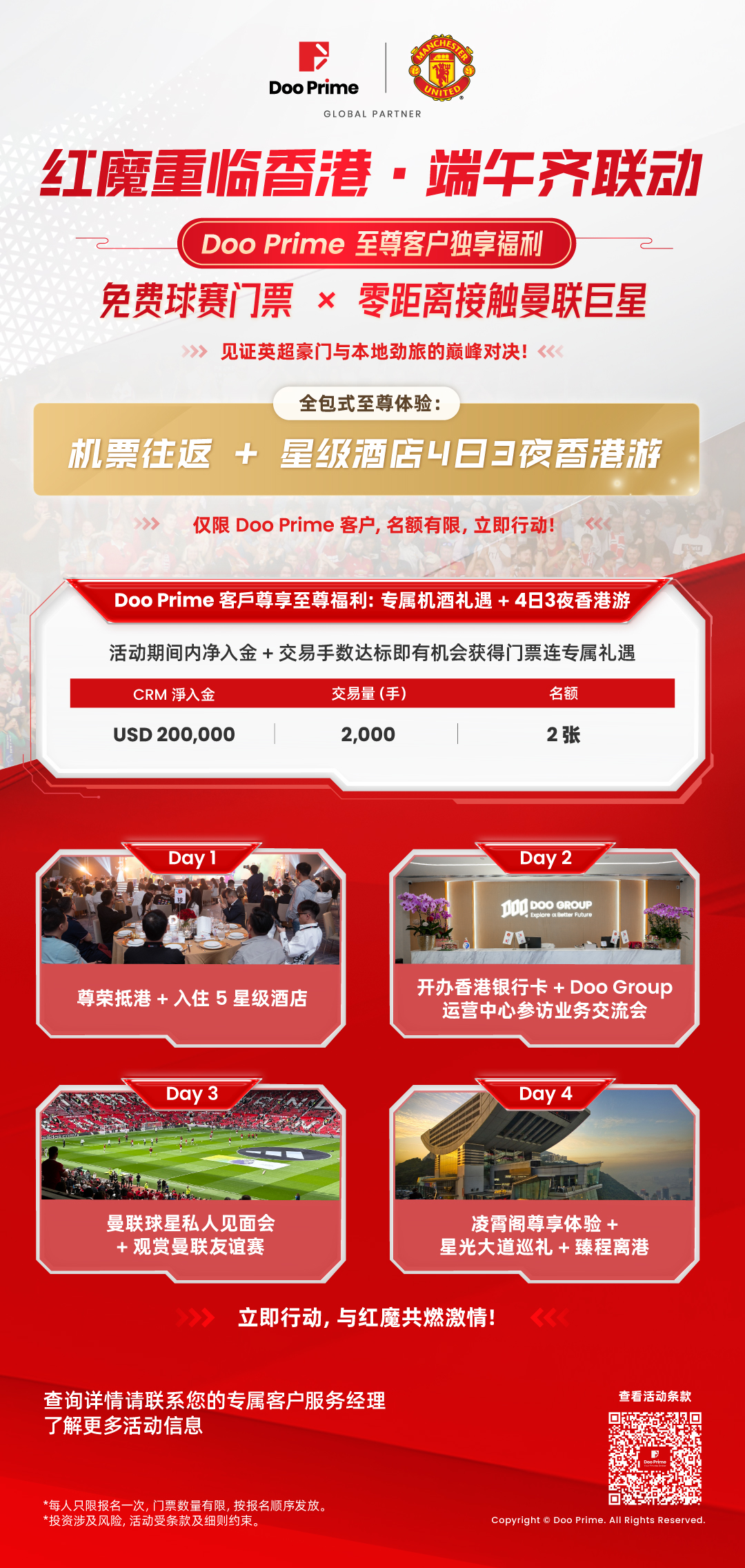 当英超红魔遇上东方端午,注定碰撞出激情火花!值此 Doo Prime 与曼联合作三周年之际,为感恩客户与球迷的热爱,曼联现役球星将于 5 月 30 日重临香港,在香港举办超燃粉丝见面会!恰逢端午佳节,Doo Prime 特别推出 「限定门票+球场观赛」双重福利,邀您与红魔零距离互动,共度热血端午!