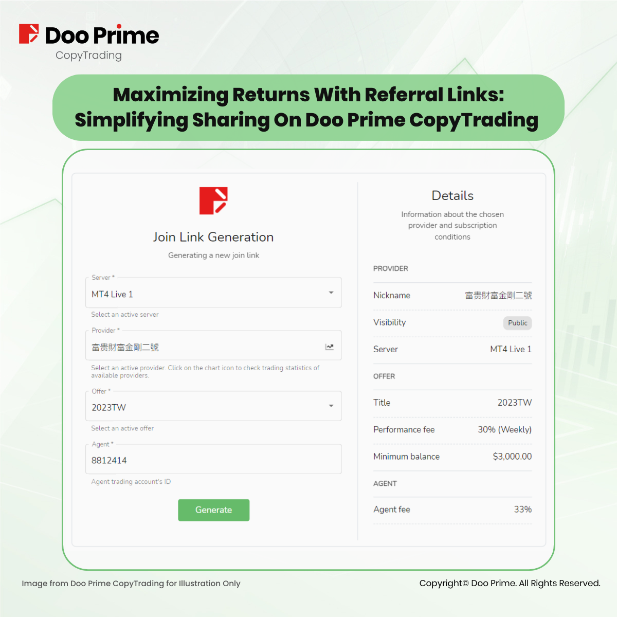 Even if the signal provider remains private, promoters can exclusively circulate it to potential followers through their unique referral links. This innovative feature not only simplifies the process but also motivates followers to actively participate in sharing and nurturing the growth of the Doo Prime CopyTrading community.